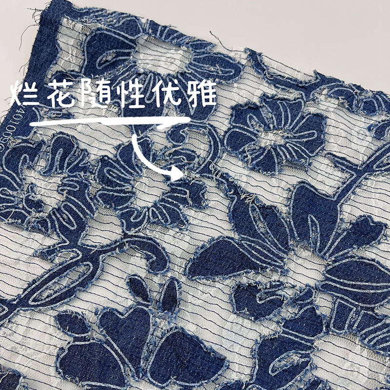 定制牛仔烂花面料蕾丝复牛仔布绣花布连衣裙衣服时装面料高定布